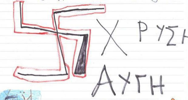 Μία παιδική ζωγραφιά με τη σβάστικα και υπογραφή «χάιλ χίτλερ», με παιδιάστικα γράμματα, παρουσιάστηκε στη σημερινή δικάσιμο της δίκης της Χρυσής Αυγής.