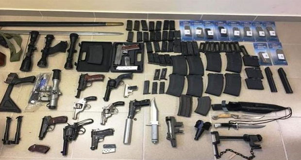 Κατά την αστυνομική επιχείρηση εντοπίστηκαν και κατασχέθηκαν σε διάφορα σημεία 16 πυροβόλα όπλα, 6 κινητά τηλέφωνα, 19 σπρέι πιπεριού, 2.773 σφαίρες, 49 γεμιστήρες, 8 κλείστρα πιστολιού, 2 πτυσσόμενες αστυνομικές ράβδοι, 6 τέιζερ. 2 εκτοξευτήρες φωτοβολίδων, ένα μαχαίρι και πλήθος εγγράφων, αποδεικτικών των αγοραπωλησιών.