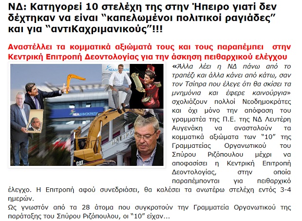 Για παράδειγμα, στην Ήπειρο ανέστειλε τα κομματικά αξιώματα σε πολλά στελέχη της ΝΔ επειδή δεν συμφωνούν με τις επιλογές για στήριξη της υποψηφιότητας του νυν περιφερειάρχη Αλέκου Καχριμάνη.