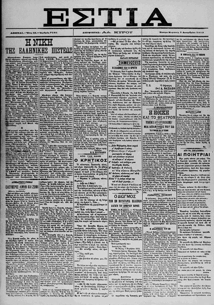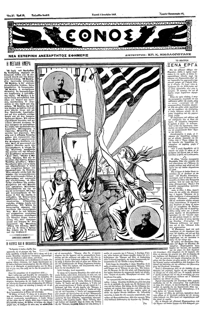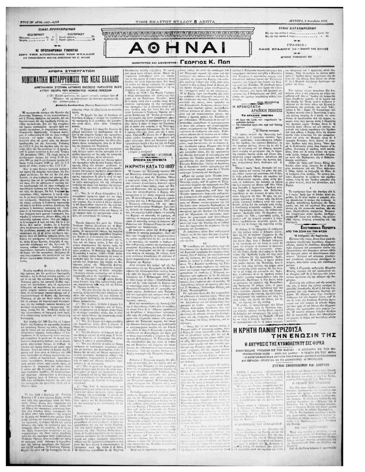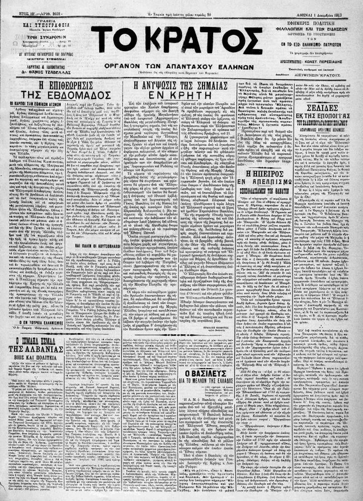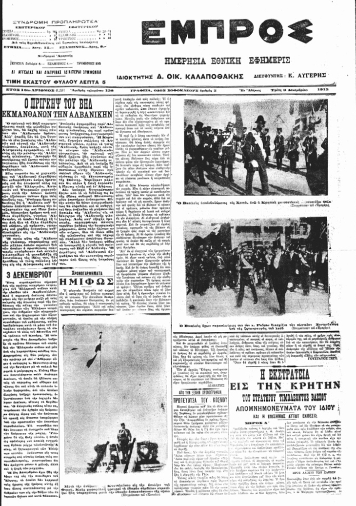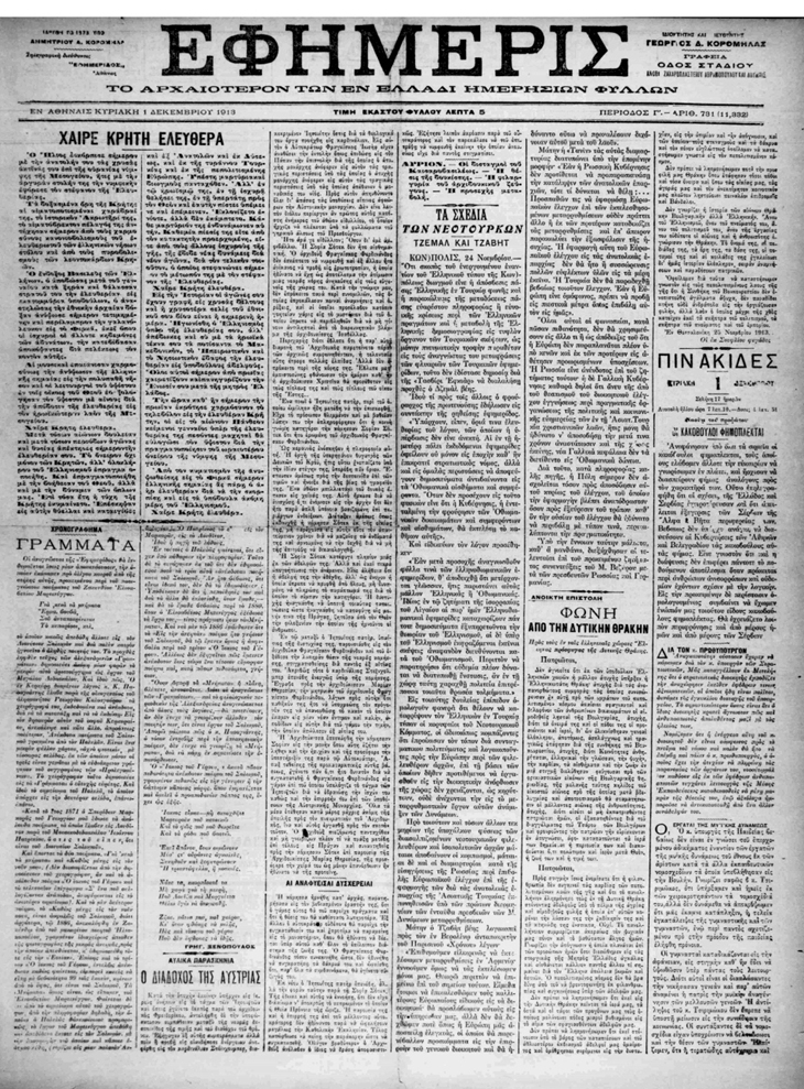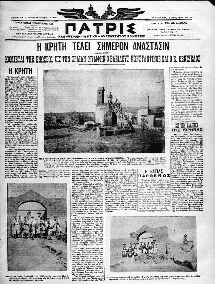 Παρουσιάζουμε επίσης τα πρωτοσέλιδα των εφημερίδων της εποχής, που με θριαμβευτικό τρόπο κατέγραψαν το ιστορικό γεγονός. Παράλληλα, αναδημοσιεύουμε ρεπορτάζ της «Εστίας» από τις εκδηλώσεις για την ένωση της Κρήτης κι ένα κείμενο της Ρεθυμνιώτισσας πρωτοπόρου του γυναικείου κινήματος Καλλιρρόης Παρρέν που δημοσιεύτηκε στην «Εφημερίδα των Κυριών», που εξέδιδε η ίδια, στο τεύχος 15-30 Νοεμβρίου 1913 (φυσικά η εφημερίδα είχε εκδοθεί μετά την 1η Δεκεμβρίου, αλλά προφανώς η ημερομηνία που αναγραφόταν σχετιζόταν με τα γεγονότα του δευτέρου δεκαπενθημέρου του Νοεμβρίου που φιλοξενήθηκαν σ’ αυτήν).