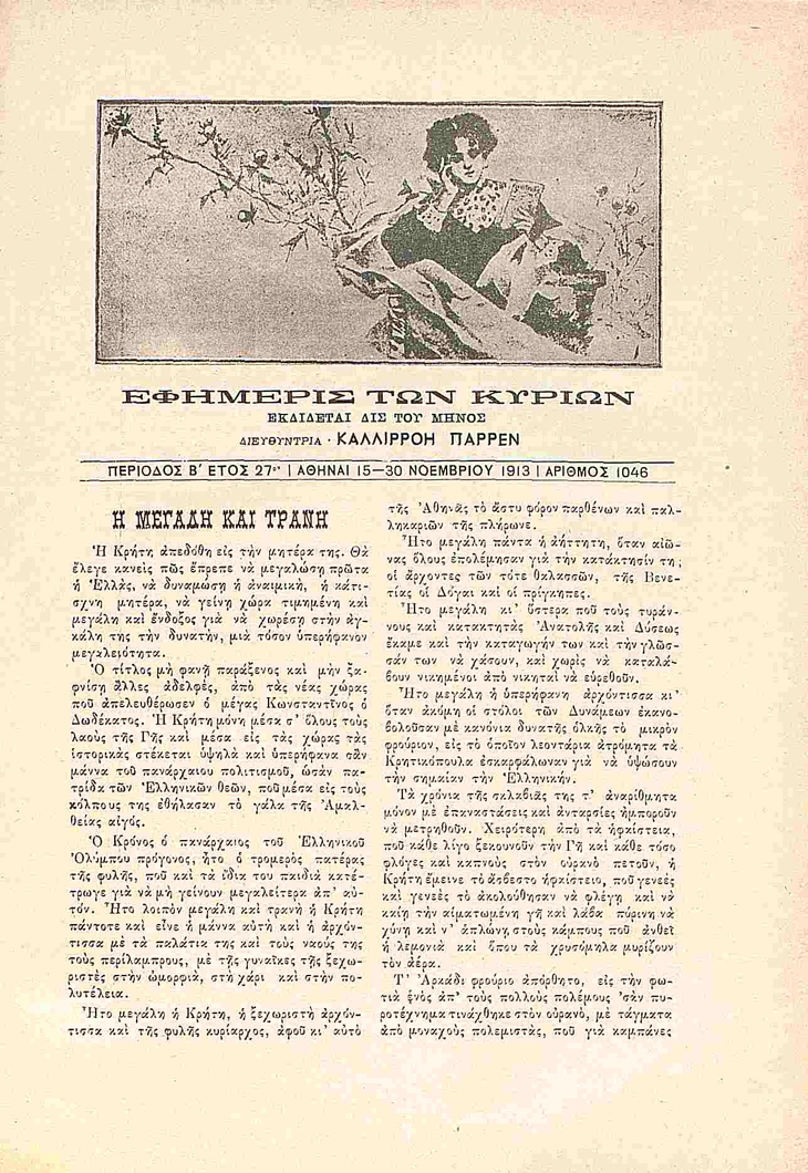 Ο τίτλος μη φανή παράξενος και μην ξαφνίση άλλες αδελφές, από τας νέας χώρας που απελευθέρωσεν ο μέγας Κωνσταντίνος ο Δωδέκατος. Η Κρήτη μόνη μέσα σ’ όλους τους λαούς της Γης και μέσα εις τας χώρας τας ιστορικάς στέκεται υψηλά και υπερήφανα σαν μάννα του πανάρχαιου πολιτισμού, ωσάν πατρίδα των Ελληνικών θεών, που μέσα εις τους κόλπους της εθήλασαν το γάλα της Αμαλθείας αιγός.