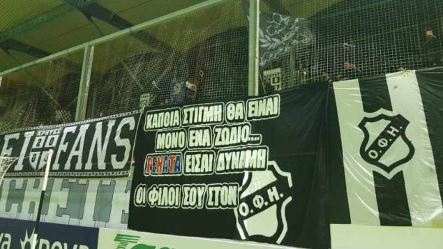 “Κάποια στιγμή θα είναι μόνο ένα ζώδιο… Ρενάτα είσαι δύναμη. Οι φίλοι σου στον ΟΦΗ”, αναγράφει το πανό.