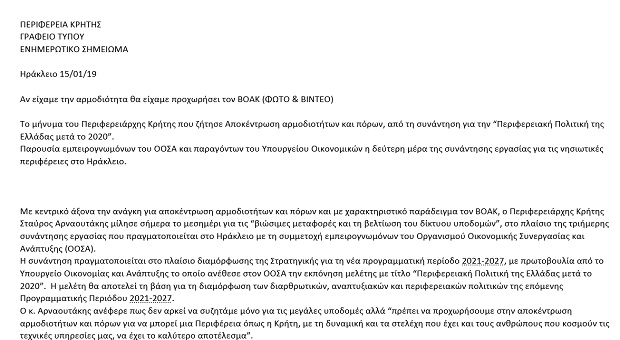 Για να καταλήξει ότι αν είχε την αρμοδιότητα του ΒΟΑΚ θα είχε… υλοποιήσει το έργο, όπως αναφέρεται και στον τίτλο της ανακοίνωσης της περιφέρειας!