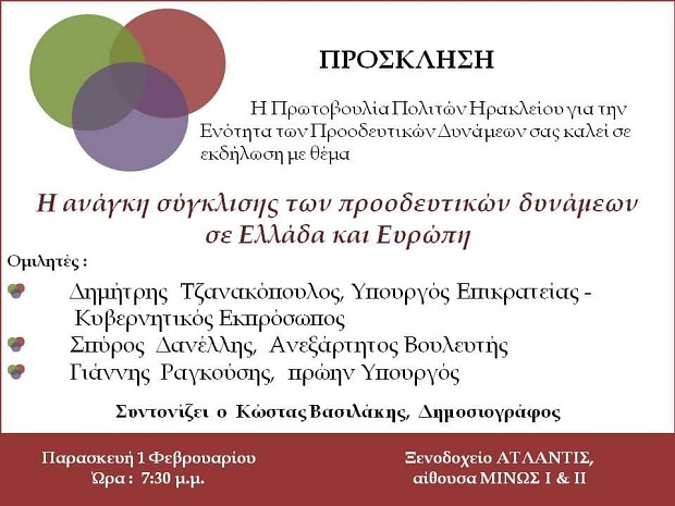 Για το λόγο αυτό η Πρωτοβουλία Πολιτών Ηρακλείου για την Ενότητα των Προοδευτικών Δυνάμεων, οργανώνει ανοιχτή εκδήλωση- συζήτηση την Παρασκευή 1 Φεβρουαρίου στις 7.30 μ.μ. στην αίθουσα «ΜΙΝΩΣ» του ξενοδοχείου «ΑΤΛΑΝΤΙΣ», με θέμα: «Η ανάγκη σύγκλισης των προοδευτικών δυνάμεων σε Ελλάδα και Ευρώπη».