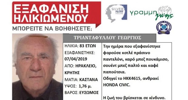 Με τον χειρότερο τρόπο έκλεισε η υπόθεση της εξαφάνισης του 83χρονου Ηρακλειώτη, Γιώργου Τριανταφύλλου, τα ίχνη του οποίου είχαν χαθεί από την περιοχή της Παντάνασσας στις αρχές του μήνα και για τον οποίο είχε σημάνει και sιlver alert στη Γραμμή Ζωής.