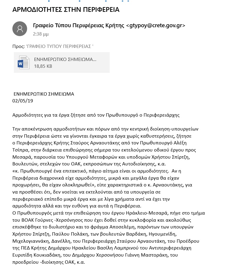 Στο πλαίσιο, πάντως, της εικονικής πραγματικότητας που θέλει να διαμορφώνει μέσω των τοπικών μέσων ο κ. Αρναουτάκης, λίγο μετά την ψυχρολουσία από τον πρωθυπουργό η περιφέρεια εξέδωσε ανακοίνωση στην οποία απλά αναφέρει ότι ο κ. Αρναουτάκης ζήτησε περισσότερες αρμοδιότητες από τον κ. Τσίπρα!