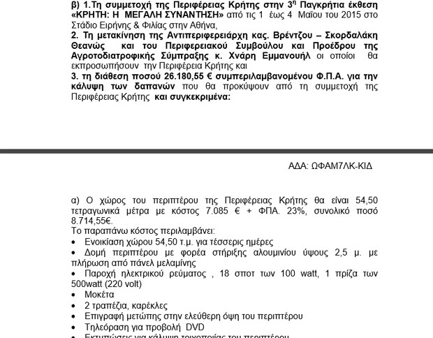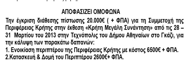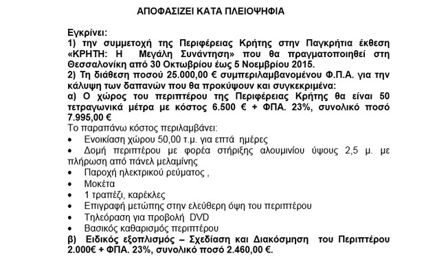 Ο δήμος Ρεθύμνου το 2015 δαπάνησε το 2015 συνολικά 19.000 ευρώ. Μάλιστα πήρε δυο διαφορετικές αποφάσεις, στην ίδια συνεδρίαση. Άλλη για τον δήμο και άλλη για το ΤΟΠΣΑ του δήμου.