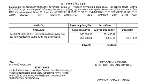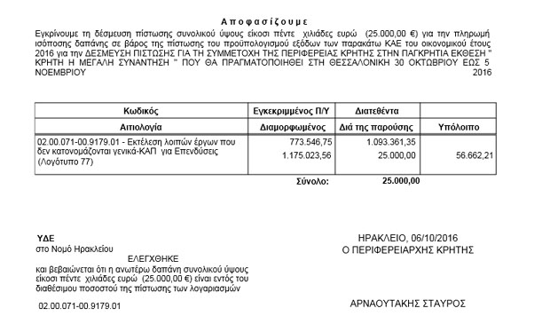 Δεν γνωρίζουμε αν υπήρξε και χρηματοδότηση από το υπουργείο Οικονομίας και Ανάπτυξης, όμως την πρώτη έκθεση, το 2013, εγκαινίασε ο τότε υπουργός, Κωστής Χατζηδάκης, ενώ αυτή του 2015, ο τότε υπουργός, Γιώργος Σταθάκης. Πάντα με τον περιφερειάρχη Κρήτης, Σταύρο Αρναουτάκη, να κρατά την κορδέλα των εγκαινίων, σε όλες τις εκθέσεις!