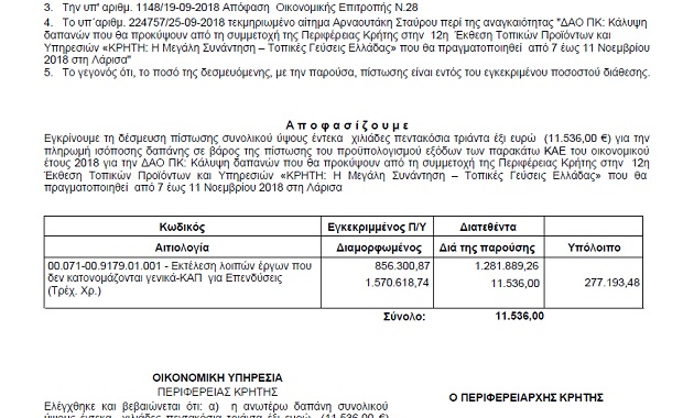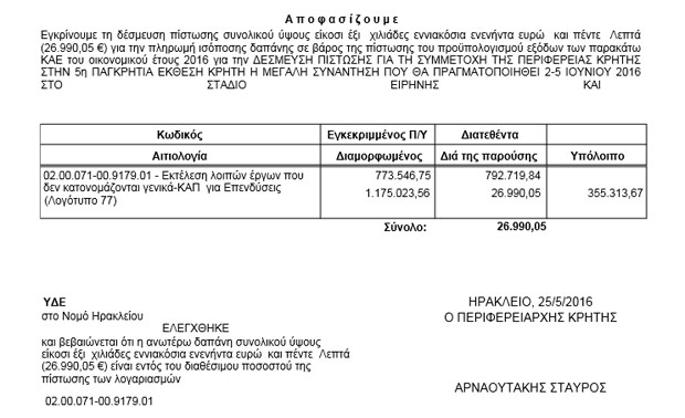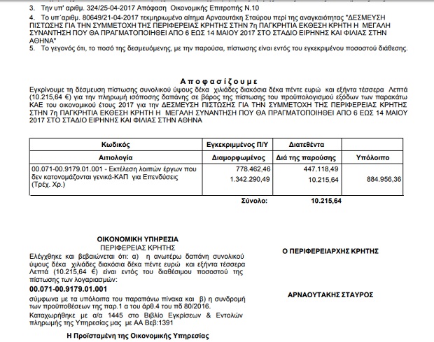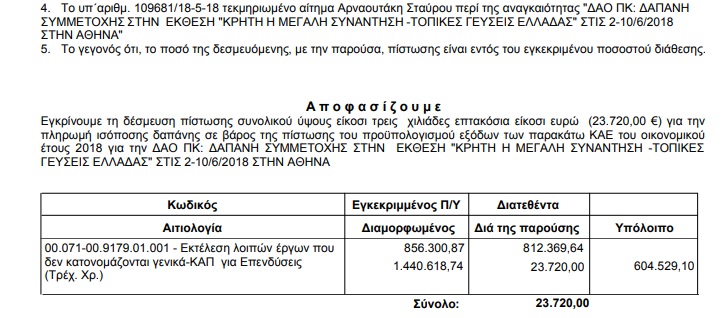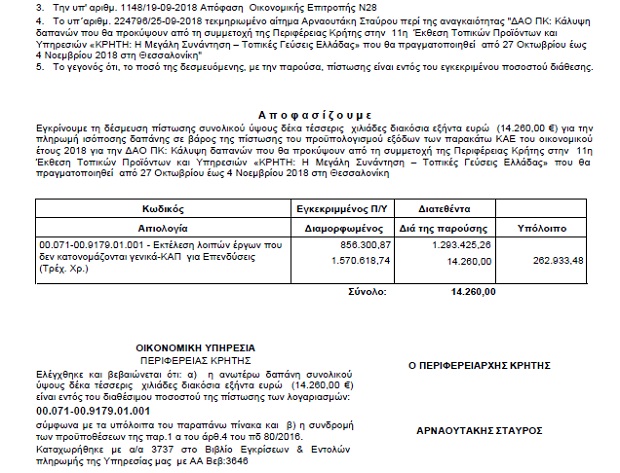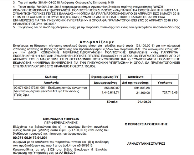 Μάλιστα, όπως προαναφέραμε, συχνά ο κ. Αρναουτάκης εγκρίνει ξεχωριστές δαπάνες για τη διοργάνωση, άλλοτε ως προϊστάμενος της διεύθυνσης Κοινωνικής Μέριμνας κι άλλοτε ως προϊστάμενος της διεύθυνσης Αγροτικής Οικονομίας.