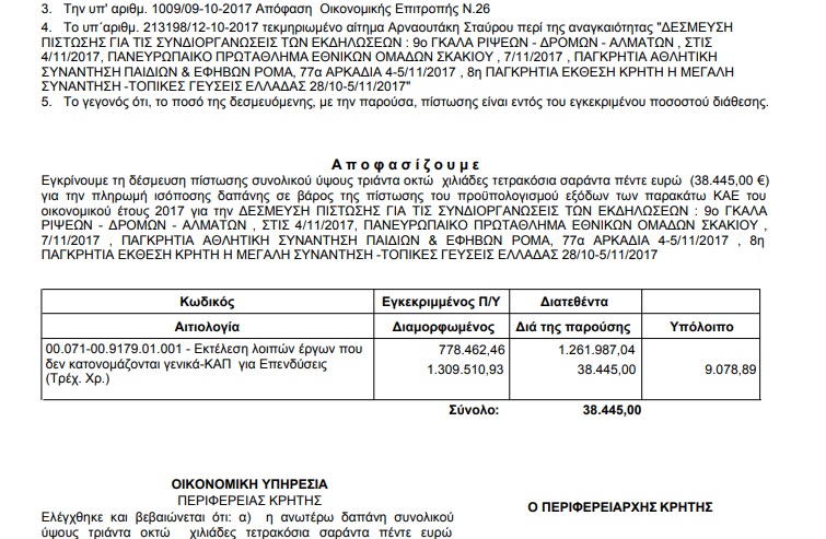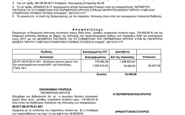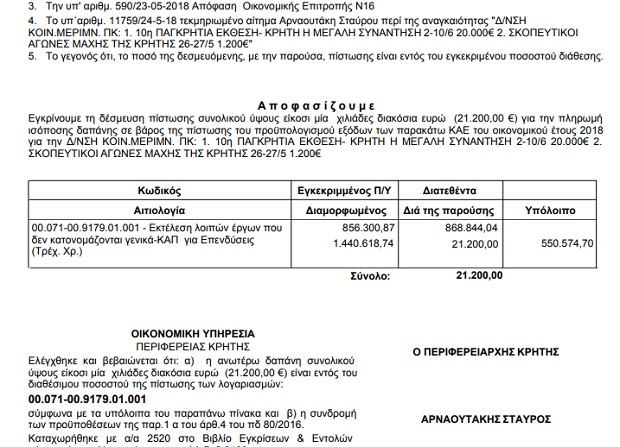 Αλλά οι χρηματοδοτήσεις για το 2018 δε σταματούν εδώ. Μόλις χθες ο κ. Αρναουτάκης υπέγραψε άλλες δυο αποφάσεις με τις οποίες η περιφέρεια θα πληρώσει για τις δραστηριότητες που αναπτύσσει ο σύμβουλός του, άλλα 25.800 ευρώ!