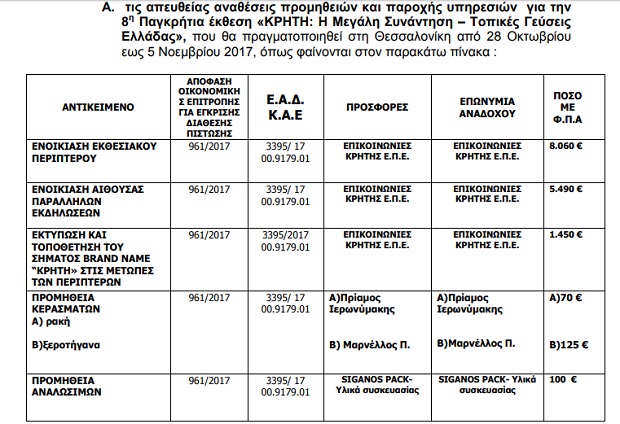 Με απίστευτα ποσά από την περιφέρεια χρηματοδοτεί τις ιδιωτικές επιχειρηματικές δραστηριότητες συνεργάτη, μέλους του περιφερειακού συμβουλίου, ο περιφερειάρχης Κρήτης, Σταύρος Αρναουτάκης, υπογράφοντας μάλιστα ο ίδιος τις χρηματοδοτήσεις, με τη μορφή των απευθείας αναθέσεων! Συχνά ο κ. Αρναουτάκης (που εμφανίζεται στις αποφάσεις να είναι εκείνος που κάνει αίτημα αλλά και εγκρίνει το… δικό του αίτημα!) εγκρίνει ξεχωριστές δαπάνες για τη διοργάνωση, άλλοτε ως προϊστάμενος της διεύθυνσης Κοινωνικής Μέριμνας κι άλλοτε ως προϊστάμενος της διεύθυνσης Αγροτικής Οικονομίας, θέλοντας να είναι στο όριο του νόμου για τις απευθείας αναθέσεις!