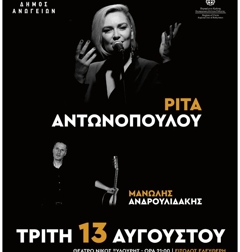 Την ίδια ημέρα (13 Αυγούστου) θα πραγματοποιηθεί συναυλία με την Ρίτα Αντωνοπούλου και τον Μανόλη Ανδρουλιδάκη σε συνδιοργάνωση με την Περιφέρεια Κρήτης και την Π.Ε. Ρεθύμνου στο Θέατρο ‘’Νίκος Ξυλούρης’’ και ώρα 21.00 με ελεύθερη είσοδο για τους πολίτες.