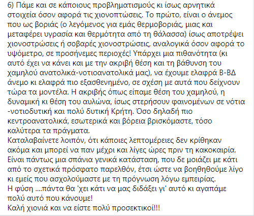 6) Πάμε και σε κάποιους προβληματισμούς κι ίσως αρνητικά στοιχεία όσον αφορά τις χιονοπτώσεις. Το πρώτο, είναι ο άνεμος που ως βοριάς (ο λεγόμενος για εμάς θερμοβοριάς, μιας και μεταφέρει υγρασία και θερμότητα από τη θάλασσα) ίσως αποτρέψει χιονοστρώσεις ή σοβαρές χιονοστρώσεις, αναλογικά όσον αφορά το υψόμετρο, σε προσήνεμες περιοχές! Υπάρχει μια πιθανότητα (κι αυτό έχει να κάνει και με την ακριβή θέση και τη βάθυνση του χαμηλού ανατολικά-νοτιοανατολικά μας), να έχουμε ελαφρά Β-ΒΔ άνεμο κι ελαφρά πιο εξασθενημένο, σε σχέση με αυτά που δείχνουν τώρα τα μοντέλα. Η ακριβής όπως είπαμε θέση του χαμηλού, η δυναμική κι θέση του αυλώνα, ίσως στερήσουν φαινομένων σε νότια -νοτιοδυτική και πολύ δυτική Κρήτη. Όσο δηλαδή πιο κεντροανατολικά, εσωτερικά και βόρεια βρισκόμαστε, τόσο καλύτερα τα πράγματα. Καταλαβαίνετε λοιπόν, ότι κάποιες λεπτομέρειες δεν κρίθηκαν ακόμα και μπορεί να παν μέχρι και λίγες ώρες πριν τη κακοκαιρία. Είναι πάντως μια σπάνια γενικά κατάσταση, που δε μοιάζει με κάτι από το σχετικά πρόσφατο παρελθόν, έτσι ώστε να βοηθηθούμε λίγο κι εμείς που ασχολούμαστε με τη πρόγνωση λόγω εμπειρίας.