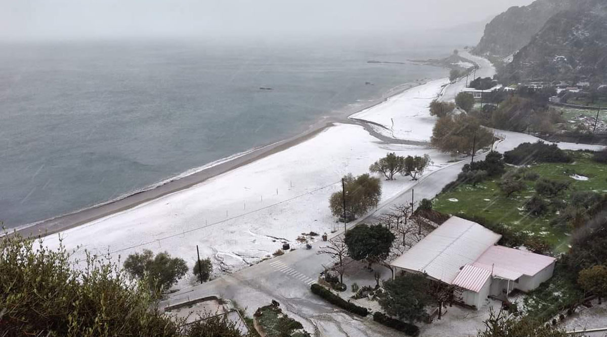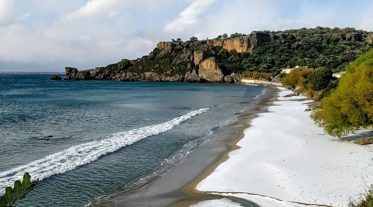 Στην όμορφη παραλία του Ροδάκινου, έπεσε ικανή ποσότητα χιονιού από τις χαμηλές θερμοκρασίες της Μήδειας, με αποτέλεσμα να «το στρώσει».