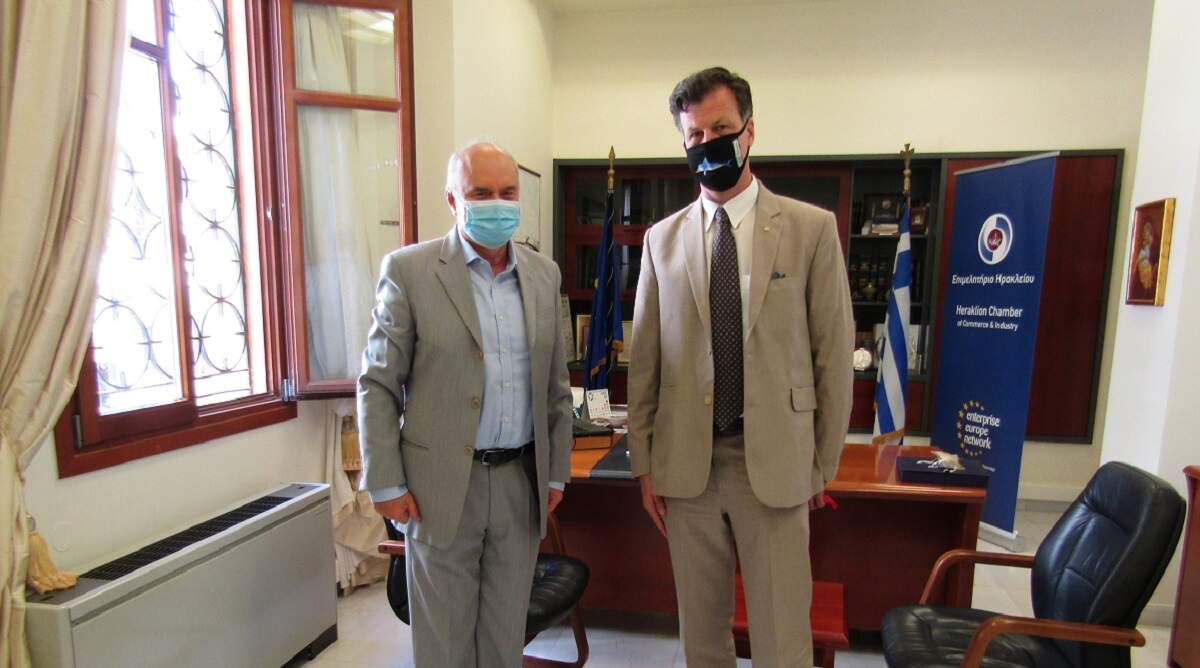 Κατά την εποικοδομητική συνάντησή του με τον Πρόεδρο του Επιμελητηρίου Ηρακλείου κ. Μανώλη Αλιφιεράκη ο Καναδός διπλωμάτης αναφέρθηκε στο κρασί, το ελαιόλαδο και το τυρί που παράγονται στην Κρήτη και είναι γνωστά στο καναδικό καταναλωτικό κοινό και δήλωσε την προθυμία της Καναδικής Πρεσβείας να συνεργαστεί με το Επιμελητήριο για την ενίσχυση της εξαγωγικής δραστηριότητας των επιχειρήσεων τροφίμων της Κρήτης προς τον Καναδά.