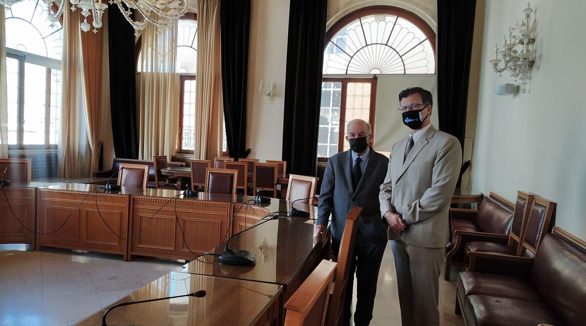 Ο Δήμαρχος έδειξε στον κ. Allen και την αίθουσα «Ελευθέριος Βενιζέλος» στη Λότζια, μια από τις ωραιότερες αίθουσες συνεδριάσεων δημοτικού συμβουλίου στην Ελλάδα, από την οποία ο Πρέσβης έμεινε εντυπωσιασμένος.