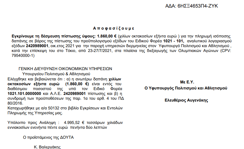 «Εγκρίνουμε τη δέσμευση πίστωσης ύψους: 19.840,00 € (δέκα εννέα χιλιάδων οκτακοσίων σαράντα ευρώ ) για την πληρωμή ισόποσης δαπάνης σε βάρος της πίστωσης του προϋπολογισμού εξόδων του Ειδικού Φορέα 1021 – 101, αναλυτικού λογαριασμού εξόδων 2420906001, οικ. ετος 2021 για την φωτογραφική κάλυψη και βιντεοσκόπηση των αθλητικών εκδηλώσεων και δραστηριοτήτων στο πλαίσιο των Δημοσίων Σχέσεων του Υφυπουργού Πολιτισμού και Αθλητισμού τόσο στην Ελληνική Επικράτεια όσο και κατά την διάρκεια των Ολυμπιακών — Παραολυμπιακών Αγώνων στο Τόκιο. Καθώς επίσης για τη δαπάνη δημιουργίας βιντεομηνυμάτων και φωτογράφισης αθλητών, προς χρήση από τα social media και τα ΜΜΕ, για τις ανάγκες της ενημερωτικής καμπάνιας «ο Αθλητισμός στο Προσκήνιο».
