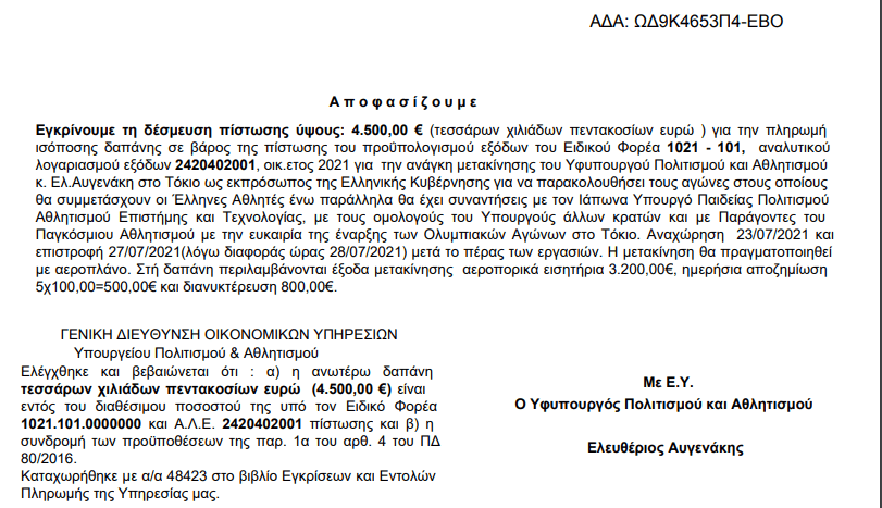 Δείτε την απόφαση για το κόστος μετακίνησης, διαμονής και… ημερήσιας αποζημίωσης του κ. Αυγενάκη.