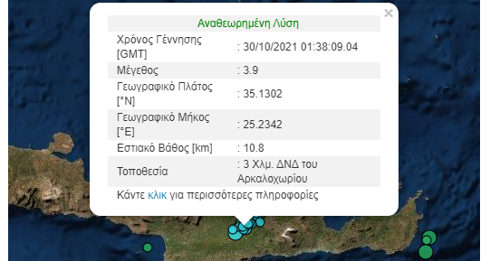 | Distances | 19 km SSE of Irákleion, Greece / pop: 137,000 / local time: 04:38:10.0 2021-10-30 8 km SSE of Ano Arhanes, Greece / pop: 3,900 / local time: 04:38:10.0 2021-10-30 |