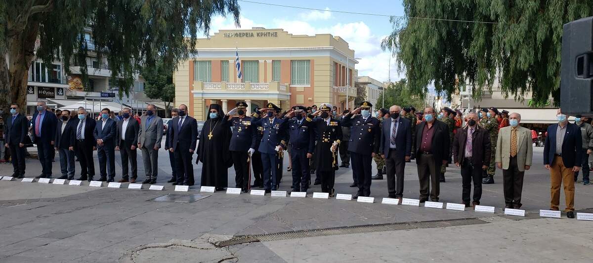 Νωρίτερα στον Ιερό Μητροπολιτικό Ναό του Αγ. Μηνά τελέστηκε επίσημη Δοξολογία και έγινε ομιλία για τον σημερινό εορτασμό από στέλεχος των Ενόπλων Δυνάμεων της Φρουράς Ηρακλείου.