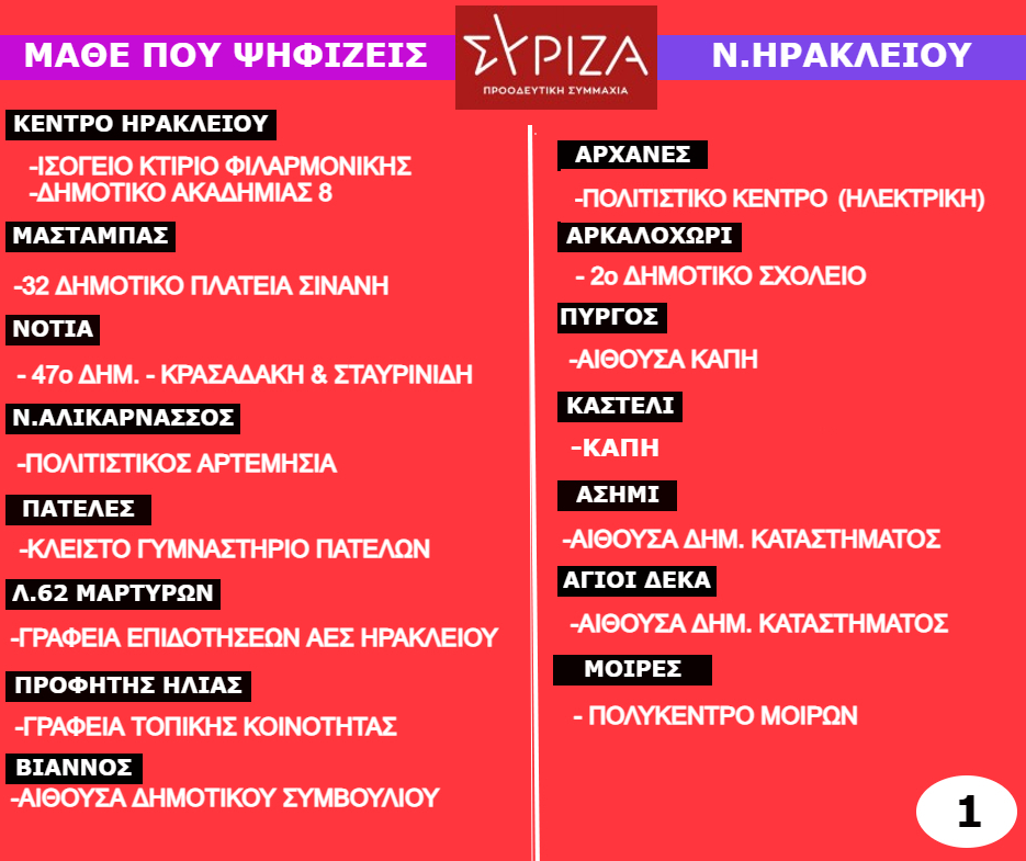 Μπορεί ωστόσο κανείς εάν την ημέρα της ψηφοφορίας βρεθεί εκτός δήμου Μαλεβιζίου, να ψηφίσει σε οποιοδήποτε εκλογικό τμήμα στην περιφέρεια Κρήτης για Πρόεδρο και Κεντρική Επιτροπή και σε οποιοδήποτε εκλογικό κέντρο της χώρας για Πρόεδρο. Όλες οι πληροφορίες για τα εκλογικά κέντρα και τη διαδικασία εκλογής υπάρχουν στην ηλεκτρονική σελίδα www.syriza.gr .