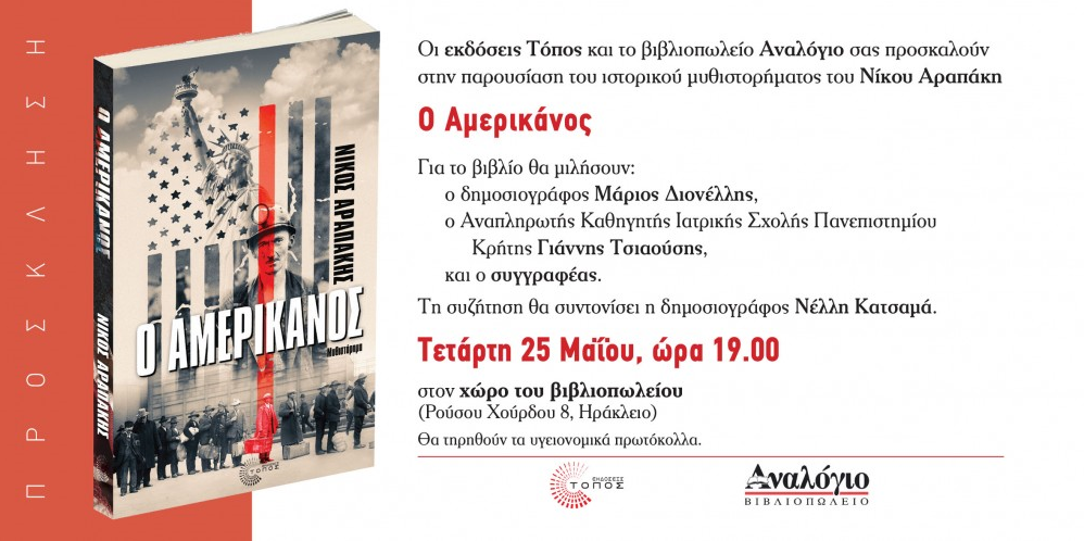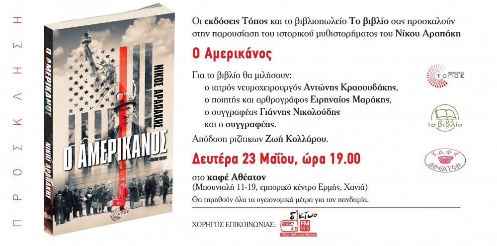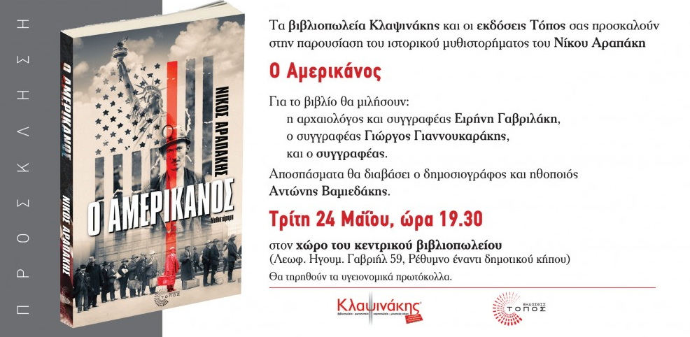 “Ο Αμερικάνος”, το νέο μυθιστόρημα του Νίκου Αραπάκη, θα παρουσιαστεί στην Κρήτη την ερχόμενη εβδομάδα. Τη Δευτέρα 23 Μαΐου στις 7 μμ στα Χανιά (καφέ Αθέατον), την Τρίτη στις 7:30 στο Ρέθυμνο (στο κεντρικό βιβλιοπωλείο Κλαψινάκη) και την Τετάρτη στις 7 μμ στο Ηράκλειο (στο βιβλιοπωλείο Αναλόγιο).