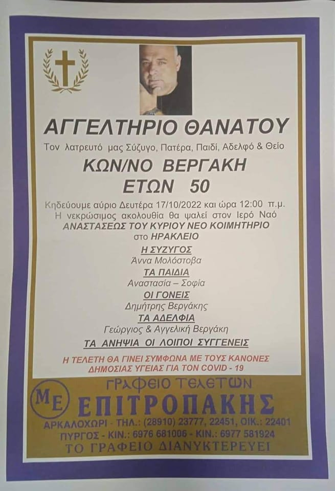 Η κηδεία του 50χρονου, πατέρα δυο παιδιών, θα γίνει τη Δευτέρα στις 12 το μεσημέρι, στο νέο Κοιμητήριο Ηρακλείου.