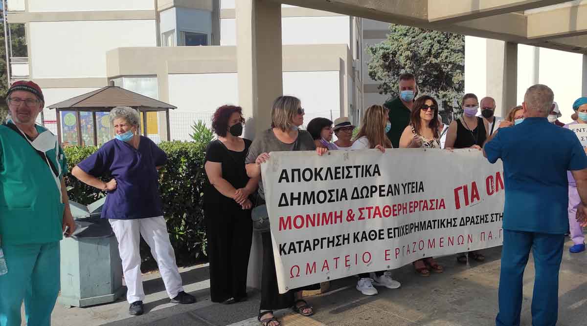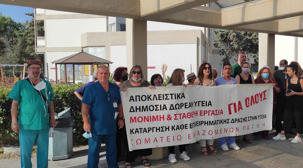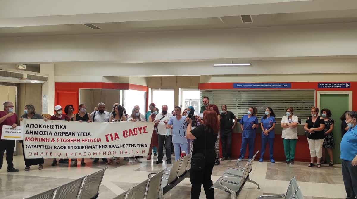• Περισσότεροι από 600 εργαζόμενοι στο ΠΑΓΝΗ είναι συμβασιούχοι, πολλοί από τους οποίους δουλεύουν πάνω από 10 χρόνια με διαφόρων ειδών ελαστικές σχέσεις απασχόλησης. Τέλος Σεπτέμβρη λήγουν οι συμβάσεις περίπου 200 εργαζομένων (καθαριότητας, σίτισης, 3μηνίτες) του νοσοκομείου μας, που θα έρθουν αντιμέτωποι με τον κίνδυνο της ανεργίας, ενώ τυχόν απόλυσή τους θα προκαλέσει δυσλειτουργία στα υποστελεχωμένα τμήματα που στηρίζονται στους συμβασιούχους.