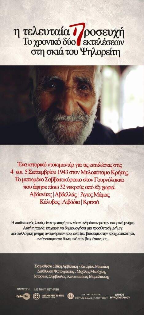 Την Κυριακή 30 Ιουλίου 2023 και ώρα 8.30 μ.μ., στον θερινό Δημοτικό Κινηματογράφο «Βηθλεέμ», θα γίνει προβολή του ιστορικού ντοκιμαντέρ με τίτλο «Η τελευταία προσευχή. Το χρονικό δύο εκτελέσεων στη σκιά του Ψηλορείτη», σκηνοθεσία Βίκη Αρβελάκη και Κατερίνα Μπικάκη.