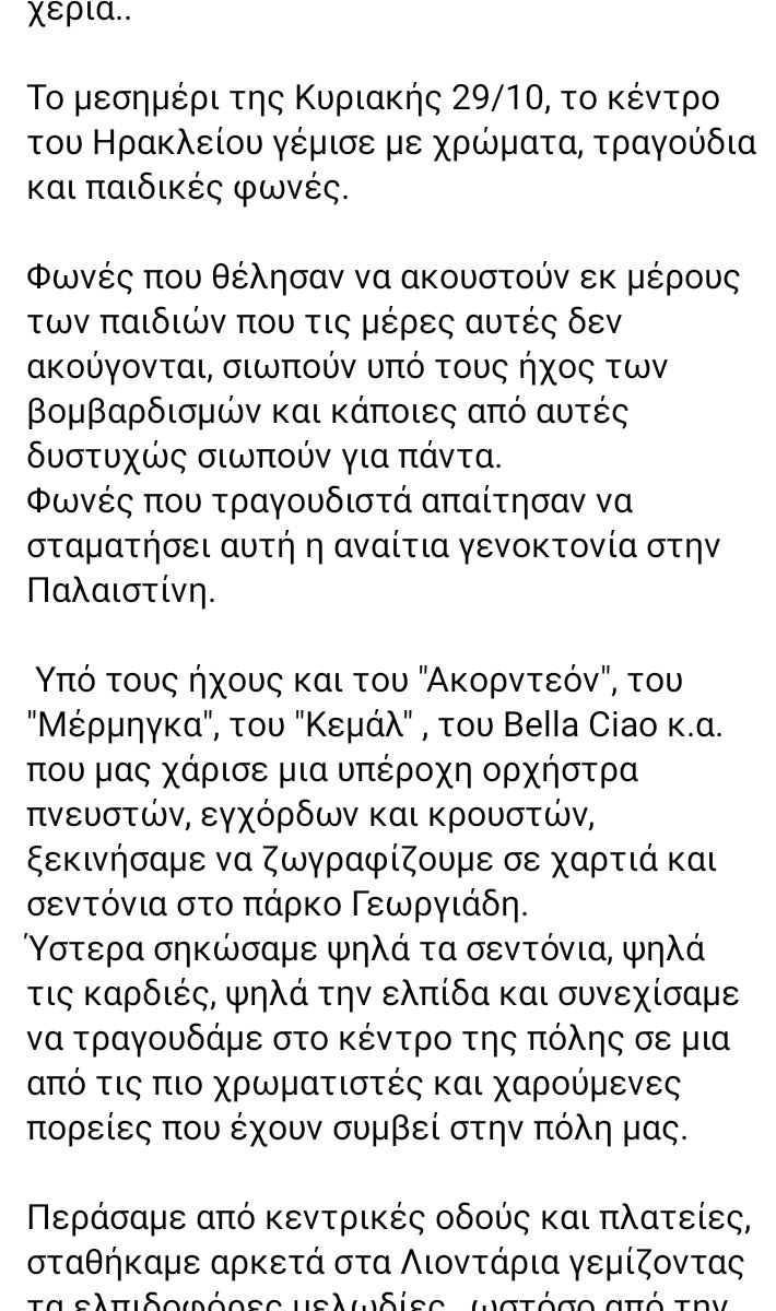 Μετά μουσικής, με τα παιδιά και τους γονείς με τα μωρά στην πρώτη γραμμή, έγιναν στο Ηράκλειο το Σαββατοκύριακο οι κινητοποιήσεις για Ειρήνη στη Γάζα.
