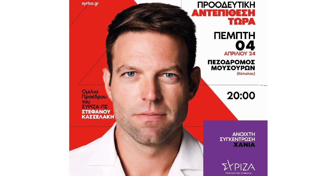 Στα Χανιά θα βρεθεί την προσεχή Πέμπτη 4 Απριλίου ο Πρόεδρος του ΣΥΡΙΖΑ-Π.Σ. Στέφανος Κασσελάκης στο πλαίσιο της 5ήμερης περιοδείας του σε όλους τους Νομούς της Κρήτης .
