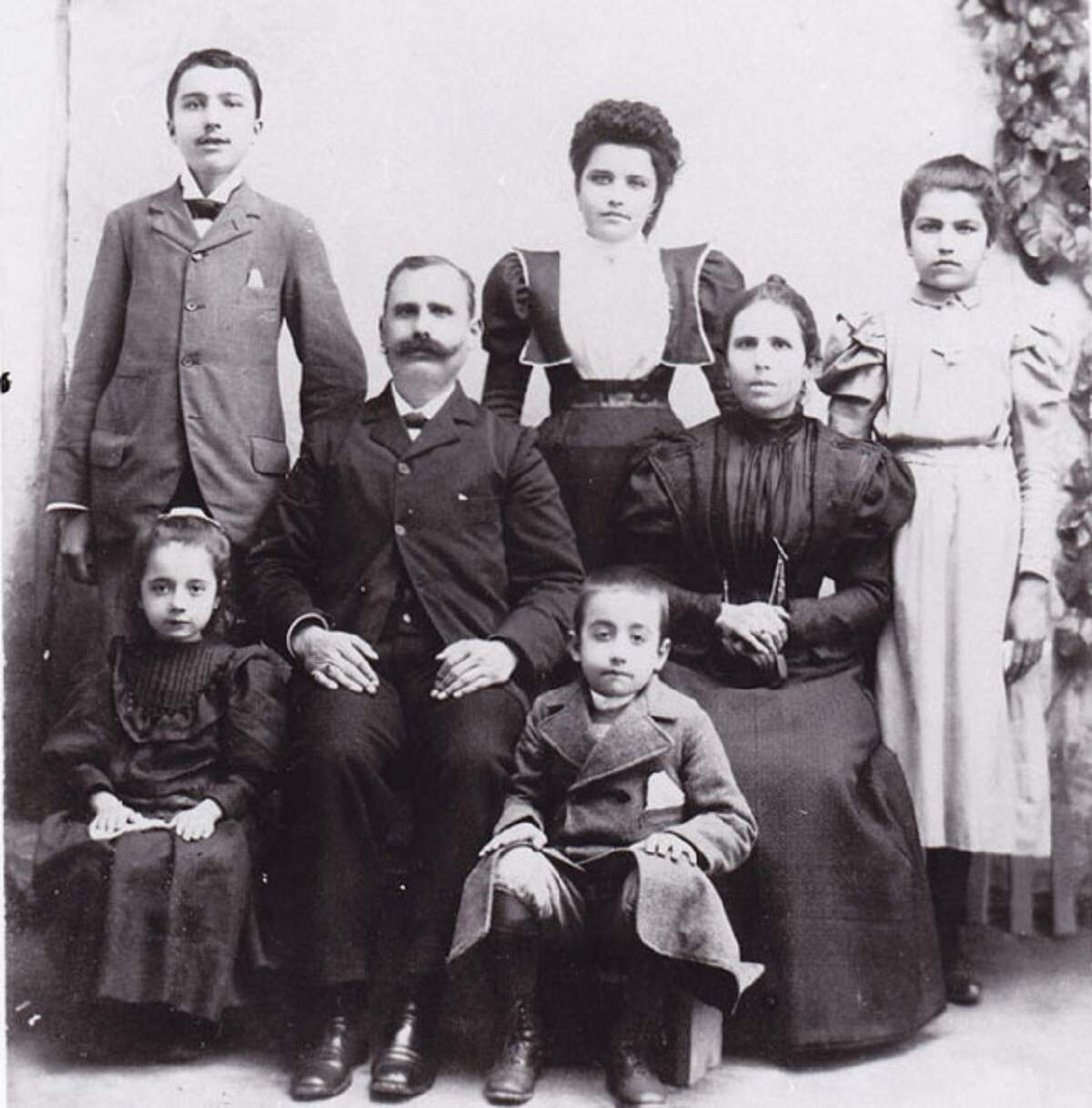 Στα 1900, όρθιοι, από αριστερά: Ο Νίκος Καζαντζάκης και οι αδελφές του Αναστασία και Ελένη. (Καθήμενοι:) Ο αδελφός της μητέρας του, Αντώνης Χριστοδουλάκης και η μητέρα του Μαρία. (Καθήμενοι μπροστά:) Τα εξαδέλφια του Άννα και Γεώργιος, τέκνα του Αντώνη Χριστοδουλάκη