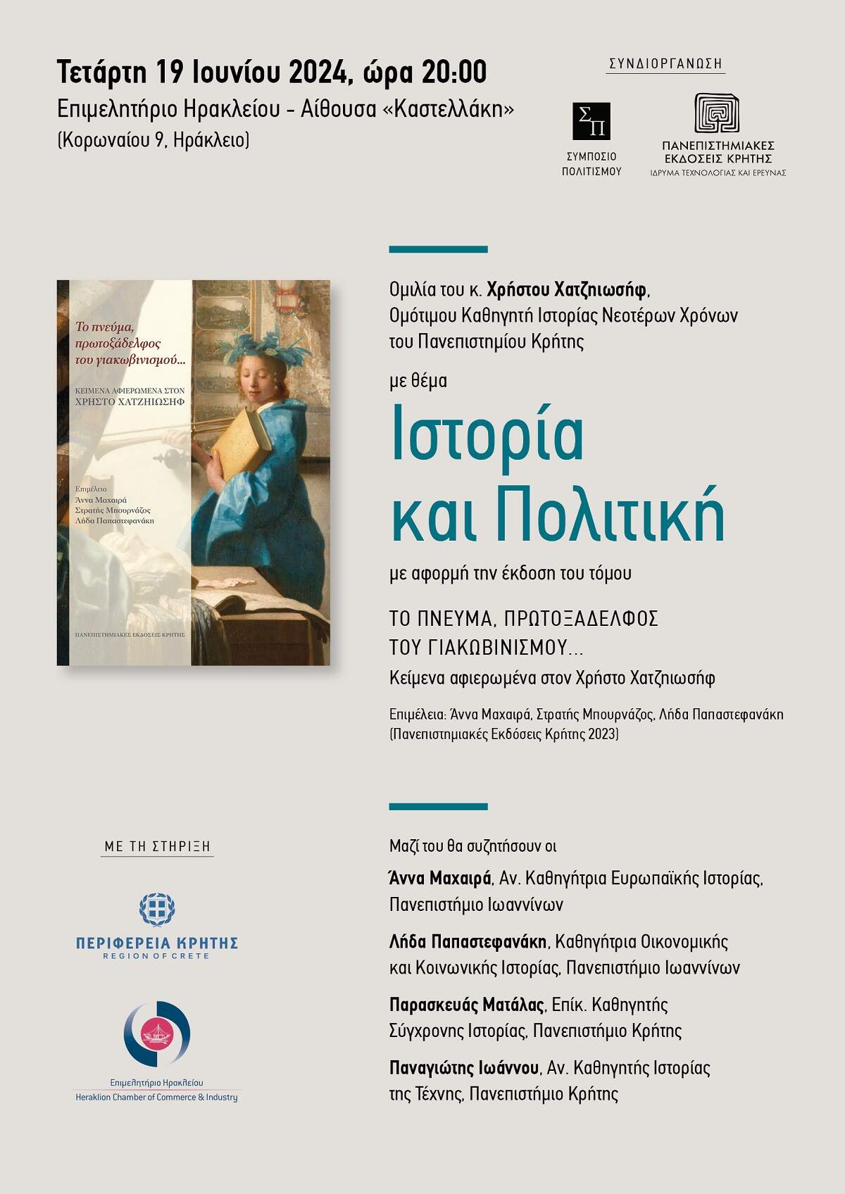 Μια βραδιά υψηλού επιστημονικού και κοινωνικο-πολιτικού λόγου θα έχουν την ευκαιρία να απολαύσουν οι πολίτες του Ηρακλείου και της Κρήτης, την προσεχή Τετάρτη 19 Ιουνίου και ώρα 8μ.μ. στην Αίθουσα «Καστελλάκη» του Επιμελητηρίου Ηρακλείου (οδός Κορωναίου 9). Θα μιλήσει ο Ομότιμος Καθηγητής Ιστορίας Νεοτέρων Χρόνων του Πανεπιστημίου Κρήτης Χρήστος Χατζηιωσήφ, με θέμα: «Ιστορία και Πολιτική», με παραδείγματα από τον Ευρωπαϊκό Διαφωτισμό και τη Γαλλική Επανάσταση, φωτίζοντας όμως εμμέσως και πτυχές του παρόντος.