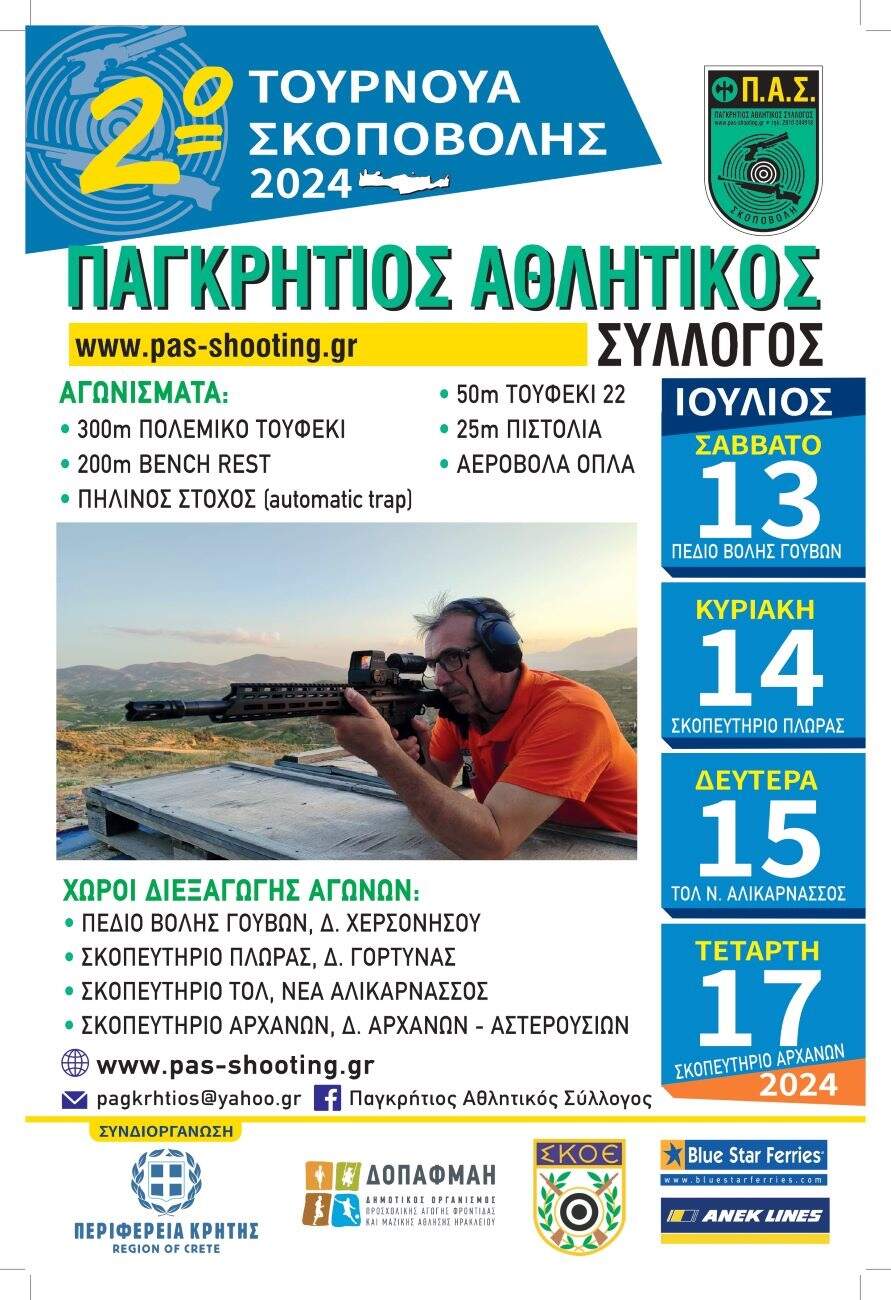 Ο Παγκρήτιος Αθλητικός Σύλλογος πραγματοποιεί το 2ο τουρνουά Σκοποβολής με την στήριξη της Περιφέρειας Κρήτης. Τα σκοπευτήρια που θα διεξαχθούν τα αγωνίσματα της σκοποβολής και οι ημερομηνίες είναι: