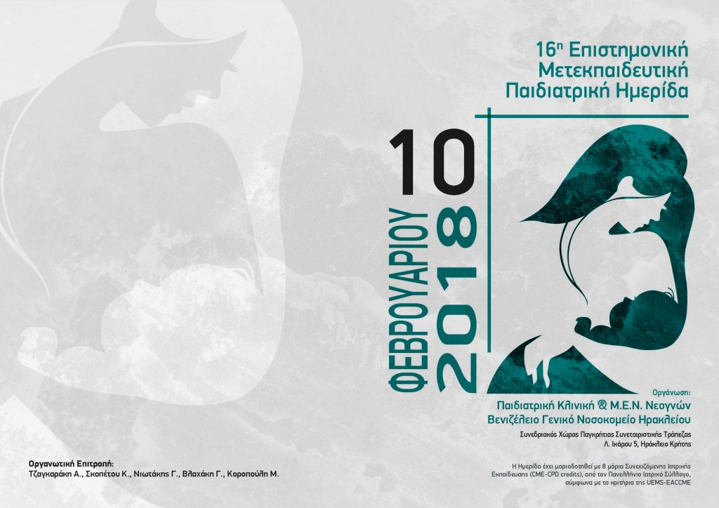 Η Παιδιατρική Κλινική και η Μονάδα Εντατικής Νοσηλείας Νεογνών του Βενιζέλειου Γενικού Νοσοκομείου Ηρακλείου διοργανώνουν για 16η χρονιά την ετήσια Επιστημονική Μετεκπαιδευτική Παιδιατρική Ημερίδα, που θα πραγματοποιηθεί στις 10/2/2018 στο Συνεδριακό Χώρο της Παγκρήτιας Συνεταιριστικής Τράπεζας (Λ. Ικάρου 5) στο Ηράκλειο Κρήτης.