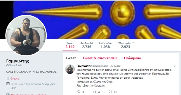 Πάντως χθες, όπως ανακοίνωσε ο ίδιος, το twitter απενεργοποίησε τον λογαριασμό του ως ύποπτο φασιστικής προπαγάνδας.