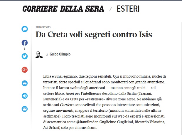 Τις πληροφορίες αυτές έρχεται να επιβεβαιώσει και δημοσίευμα της ιταλικής εφημερίδας Corriere della Serra, η οποία σημειώνει υπερσύγχρονα κατασκοπευτικά αεροσκάφη των ΗΠΑ απογειώνονται από την Κρήτη και τη Σικελία, στοχεύοντας θέσεις του Ισλαμικού Κράτους στη Λιβύη και το Σινά. Τα αεροσκάφη μπορούν να παρακολουθήσουν τις τηλεπικοινωνίες και να χαρτογραφήσουν το έδαφος, ενώ τα δεδομένα που συγκεντρώνουν αναλύονται από ειδικούς που σχεδιάζουν, προφανώς, το επόμενο βήμα.