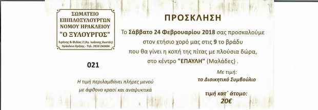 Το Σωματείο Επιπλοξυλουργών Ν. Ηρακλείου θα πραγματοποιήσει τον ετήσιο χορό και την κοπή πίτας του, το Σάββατο 24 Φεβρουαρίου 2018 στις9 το βράδυ στο κοσμικό κέντρο “ΕΠΑΥΛΗ” .