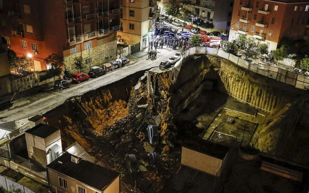Τουλάχιστον οκτώ αυτοκίνητα έπεσαν μέσα σε μεγάλη τρύπα η οποία δημιουργήθηκε στην κεντρική περιοχή Μπαλντουϊνα της Ρώμης. Στο συγκεκριμένο σημείο ήταν σε εξέλιξη έργα για τη δημιουργία υπόγειων γκαράζ. Ξαφνικά υποχώρησε ο δρόμος στον οποίο ήταν παρκαρισμένα και τα αυτοκίνητα έπεσαν μέσα στον κρατήρα.