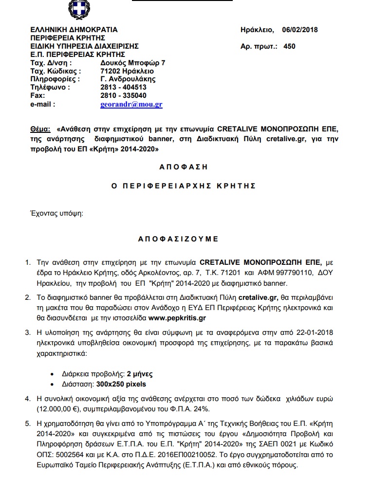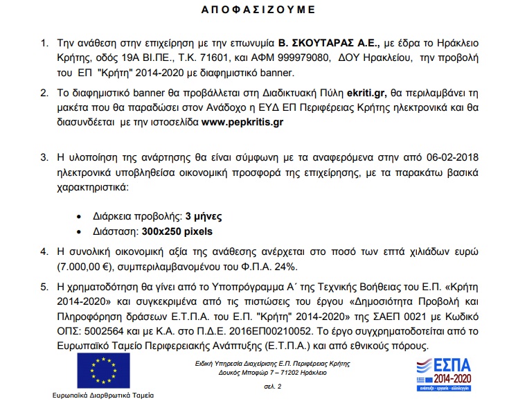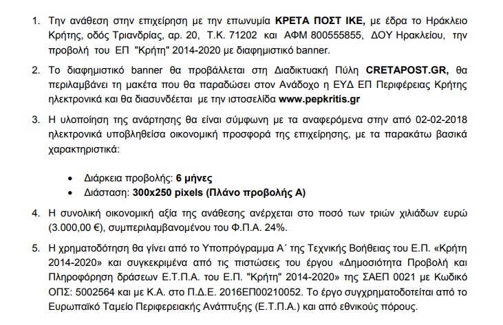 Στο Ράδιο Κρήτη, για προβολή σποτ για διάστημα 40 ημερών, 15.000 ευρώ.