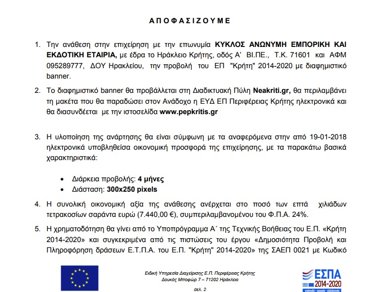 Στο συγκρότημα Creta tv- Ρεθεμνιώτικων Νέων, για συνεργασία 3 εβδομάδων, 20.000 ευρώ, ως εξής: