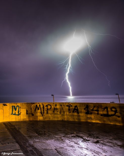 Την ίδια ώρα, μία εντυπωσιακή φωτογραφία του Γιώργου Ψιμουλάκη, που δημοσίευσε ο ίδιος στο γκρουπ των Μετεωκρητών στο Facebook, δείχνει έναν κεραυνό που κυριολεκτικά έκανε την νυχτα – μέρα!