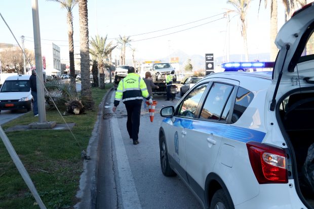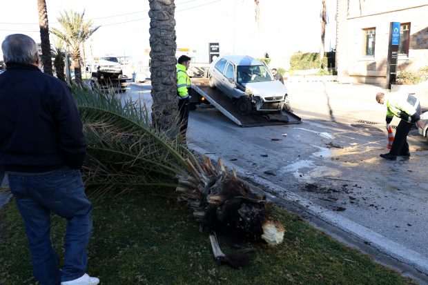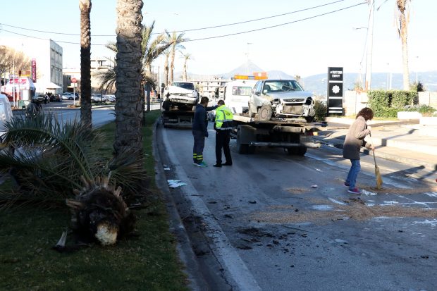 Στο συμβάν πρωταγωνιστούν δύο αυτοκίνητα και…. ένας φοίνικας από τον οποίο έπεσε ένα μέρος μετά τη σύγκρουση των οχημάτων.