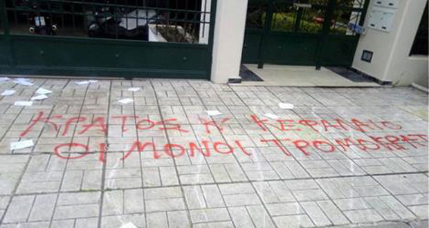 Με τρικάκια, συνθήματα και πάνο ομάδα αντιεξουσιαστών πραγματοποίησε διαμαρτυρία το απόγευμα της Κυριακής στο σπίτι του Λουκά Παπαδήμου ως «ένδειξη αλληλεγγύης στον απεργό πείνας Ντίνο Γιαγτζόγλου».