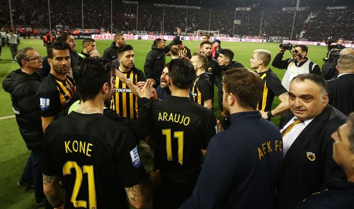 Την ίδια ώρα από τα αποδυτήρια της ΑΕΚ το κλίμα ήταν εντελώς αντίθετο, αφού οι κιτρινόμαυροι τόνιζαν πως «μπάλα με όπλα δεν παίζουμε».