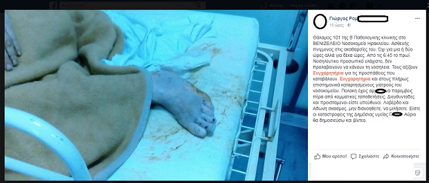 “Θάλαμος 101 της Β Παθολογικης κλινικης στο ΒΕΝΙΖΕΛΕΙΟ Νοσοκομείο Ηρακλείου. Ασθενής πνιγμενος στις ακαθαρσίες του. Όχι για μια ή δύο ώρες αλλά για δέκα ώρες. Από τις 6:45 το πρωί. Νοσηλευτικο προσωπικό ελάχιστο, δεν προλαβαινουν να κάνουν τη νοσηλεια. Τους αξίζουνΣυγχαρητήρια για τις προσπάθειες που καταβάλουν. Συγχαρητήρια και στους πλήρως επιστημονικά καταρτησμενους γιατρούς του νοσοκομείου. Πολακη έχεις αρχ@@ να παρεμβεις πέρα από κομματικες τοποθετήσεις; Διευθυνταδες και προισταμενοι είστε υπεύθυνοι. Λοβέρδο και Αδωνη σκασμος, μη διανοηθειτε, να μιλήσετε. Είστε οι καταστροφεις της Δημόσιας υγείας”