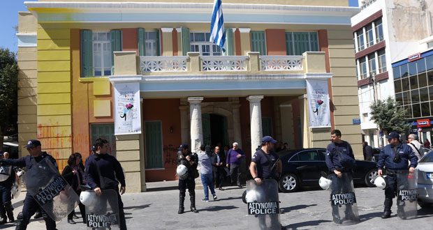Ήδη έξω από το κτίριο της Περιφέρειας Κρήτης, συλλογικότητες έχουν αναρτήσει πανό διαμαρτυρίας, για τις πολεμικές επιχειρήσεις της Τουρκίας στο Αφρίν, ενώ έχουν γραφεί και συνθήματα σε τοίχους.