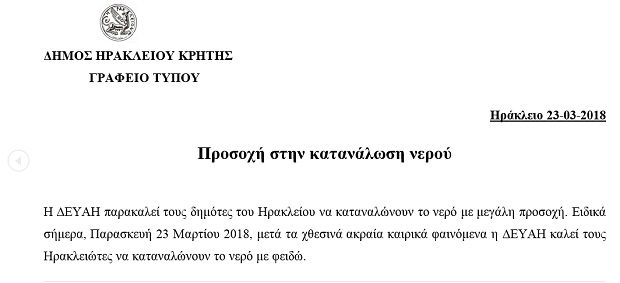 Η ΔΕΥΑΗ παρακαλεί τους δημότες του Ηρακλείου να καταναλώνουν το νερό με μεγάλη προσοχή. Ειδικά σήμερα, Παρασκευή 23 Μαρτίου 2018, μετά τα χθεσινά ακραία καιρικά φαινόμενα η ΔΕΥΑΗ καλεί τους Ηρακλειώτες να καταναλώνουν το νερό με φειδώ.