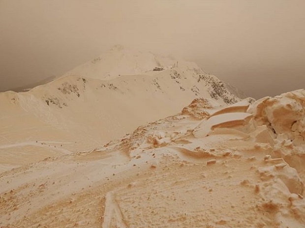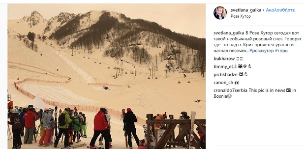 Τα βουνά της ανατολικής Ευρώπης και κυρίως της Ρωσίας καλύφθηκαν με ένα περίεργο χιόνι τις τελευταίες ώρες, που το χρώμα του είναι ροζ, κίτρινο ή και καφέ! Το εντυπωσιακό θέαμα απαθανατίζουν με φωτογραφίες και βίντεο χρήστες των κοινωνικών δικτύων, που δίνουν την ευκαιρία για ρεπορτάζ στα μεγαλύτερα ειδησεογραφικά μέσα, ανάμεσα στα οποία είναι το CNN.