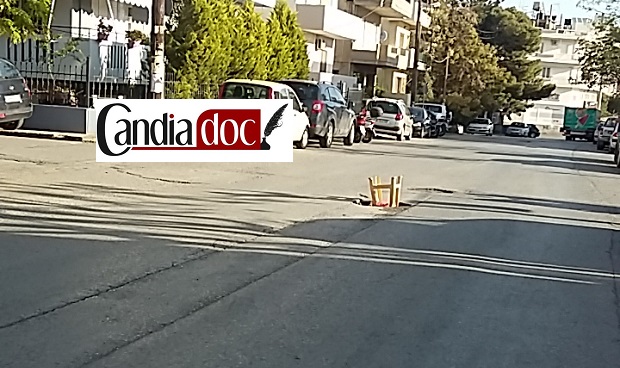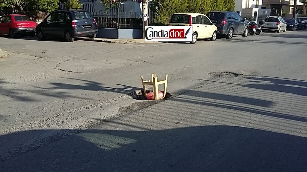 Οι φωτογραφίες είναι από την οδό Φιλελλήνων, στο Ηράκλειο, έξω από το σχολικό συγκρότημα. Η λακκούβα είναι πραγματικά επικίνδυνη, κι αφού ο δήμος δεν έσπευσε να αποκαταστήσει το πρόβλημα, το έκαναν οι περίοικοι, τοποθετώντας ένα… σκαμπό, ώστε να βλέπει ο περαστικός τον κίνδυνο.